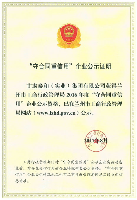 日前,蘭州市工商行政管理局對(duì)2016年度“守合同重信用企業(yè)”進(jìn)行了公示。甘肅泰和實(shí)業(yè)(集團(tuán))有限公司(以下簡(jiǎn)稱“泰和集團(tuán)”)憑借良好的企業(yè)信譽(yù),獲得了2016年度蘭州市“守合同重信用”企業(yè)榮譽(yù)稱號(hào)。
