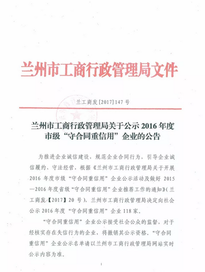 附:蘭州市工商局關(guān)于公示2016年度市級(jí)“守合同重信用”企業(yè)公告