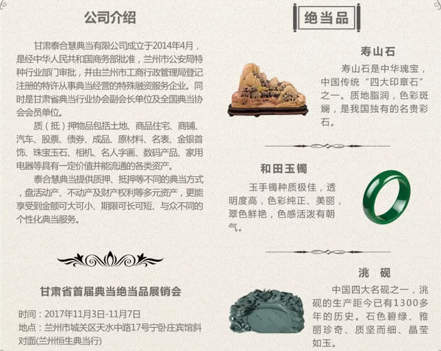 此次展銷會有全省和北京、深圳等二十多家企業(yè)積極響應(yīng)參展,展品大到房屋、車輛,小到黃金飾品、名表、字畫、文玩等。甘肅泰合慧典當(dāng)有限公司本次展品包含絕當(dāng)商鋪和房屋、中國傳統(tǒng)“四大印章石”之一的壽山石、種質(zhì)極佳的和田玉鐲、中國四大名硯之一的洮硯。