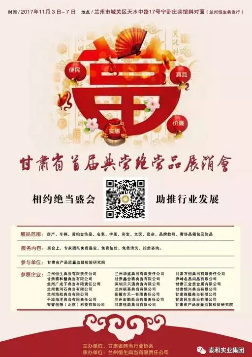 為積極響應(yīng)黨的十九大號召,落實國家“一帶一路”發(fā)展戰(zhàn)略,引導(dǎo)企業(yè)重拾民品業(yè)務(wù),拓寬經(jīng)營渠道,11月3日,甘肅省典當(dāng)行業(yè)協(xié)會在會長王喆的帶領(lǐng)下,常務(wù)副會長、秘書長楊麗與協(xié)會工作人員的精心組織下,在各會員單位的共同努力下,由協(xié)會主辦的甘肅省首屆典當(dāng)絕當(dāng)品展銷會在蘭州恒生典當(dāng)行盛大開幕。