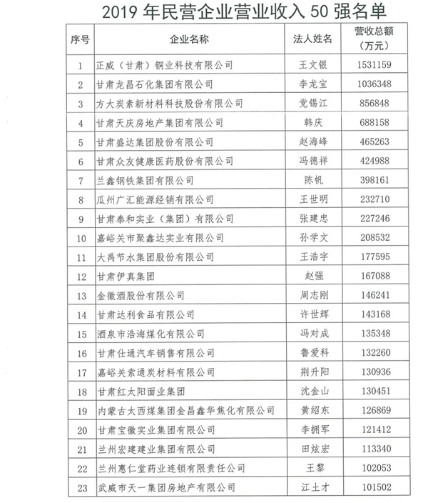 附:2019甘肅省民營企業(yè)50強(qiáng)名單