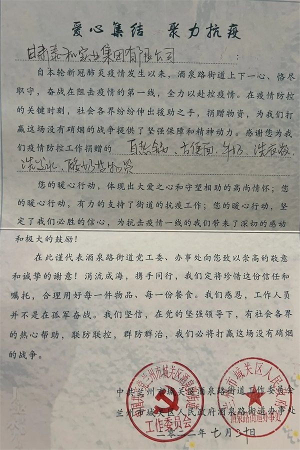疫情無情,人間有愛。7月20日,甘肅泰和實業(yè)(集團)有限公司向城關(guān)區(qū)酒泉路街道辦事處捐贈牛奶、自熱米飯、方便面、洗衣液、洗發(fā)水、酸奶等生活及防疫物資,全力支持疫情防控工作。